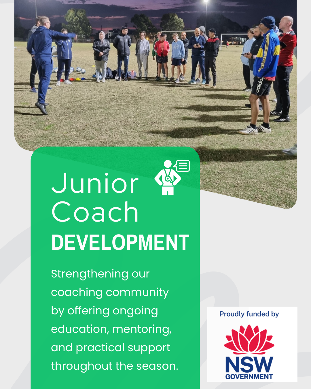 Roselands FC is committed to continually strengthening the skills and confidence of our coaches across all age groups. This year, we were fortunate to receive funding from the NSW Government to support our Coach Development Program. This grant has enabled us to provide dedicated training, education, and support for our volunteer coaches, helping them deliver quality sessions, build their capability, and continue fostering a positive football experience for every player at our club.